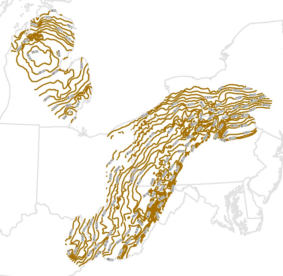 Description: This is a measured depth contour map constructed upon the top of Devonian Mixed Carbonates and Clastics in Ohio, New York, Pennsylvania, Maryland, West Virginia and Kentucky and laterally equivalent Bois Blanc and Sylvania Sandstone in Michigan, as measured from ground surface.The contours were created from the related thickness grid of the overlying strata or by hand contouring using the measured depth thickness point values.Author/Originator: Battelle Memorial InstituteDate Created: 2021