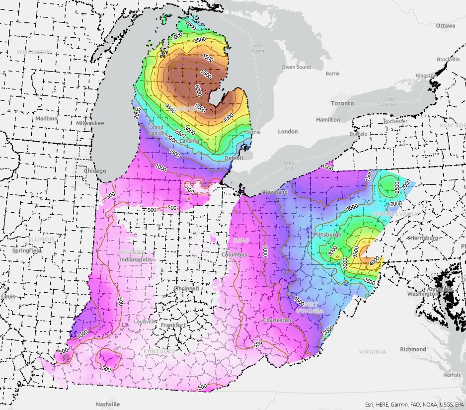 Description: This isopach map shows the thickness of the interval from the top of the Onondaga to the base of the Lockport Dolomite and latterly equivalent Devonian and Silurian units. It was created by computer interpolation (kriging) of borehole data for much of the map extent. In several places the computer generated contours were modified by hand to accommodate faults or where such modification was deemed necessary by other geologic information that was available. In Kentucky, the extensive faulting required that the data be interpolated by hand. The map shows the thickness from the top of the Traverse Limestone to the base of the Niagara Group within Michigan. Within Indiana the thickness is displayed by the tops of the Traverse in eastern Indiana and North Vernon Limestone in western Indiana, to the top of the Salamonie Dolomite. In western Ohio, the top of the Olentangy to the base of the Lockport Dolostone is the thickness. In eastern Kentucky the top of the Onondaga Limestone to the base of the Lockport Dolostone composes the thickness. In West Virginia there is a facies change from east to west between the McKenzie formation and the Lockport Dolostone. There is also a facies change from east to west between the Needmore Shale, Huntersville Chert, and the Onondaga in West Virginia. From the tops of the Needmore, Huntersville and the Onondaga, to the base of the McKenzie and Lockport, shows the thickness in West Virginia. In Pennsylvania the Mifflintown Formation transitions to the Lockport from East to West. From the top of the Onondaga to the base of these units displays the thickness within Pennsylvania. Within Maryland the tops of the Needmore Shale and the Onondaga, which show a facies change from east to west respectively to the base of the McKenzie, is the thickness. More detailed mapping of these units is planned for phase II of the project.Author/Originator: The Geological Surveys of Ohio, Kentucky, Maryland, Michigan, Pennsylvania and West VirginiaDate Created: 2005