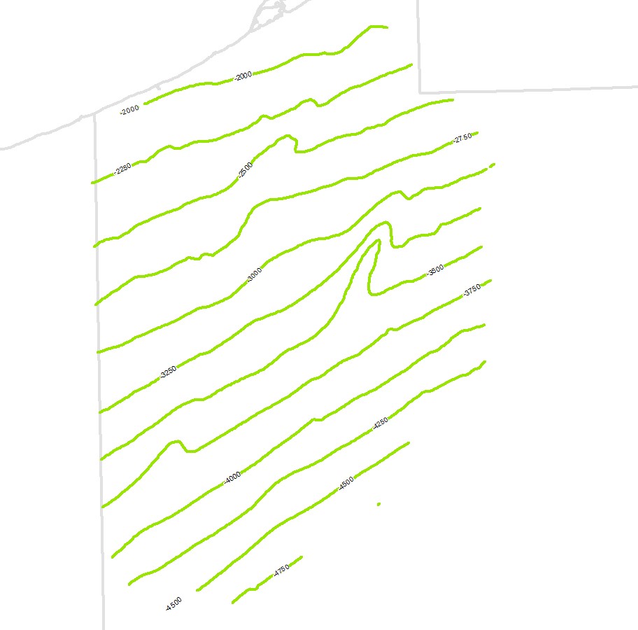 Description: This is a structure contour map constructed upon the top of the Grimsby Formation of the Medina Group in PennsylvaniaThe contours were created from the related subsurface elevation grid or by contouring by hand from the subsurface elevation point values.Author/Originator: Battelle Memorial InstituteDate Created: 2021.