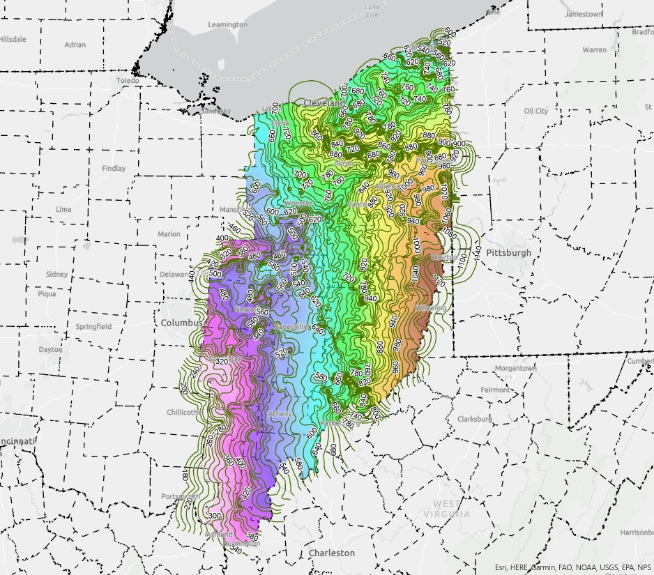 Description: This is an isopach contour map of the Salina Group in eastern Ohio. This dataset was originally created for the Midwestern Regional Carbon Sequestration Partnership 2017 final report. This data set contains subsurface information on the undifferentiated Upper Silurian Salina Group in eastern Ohio compiled from hardcopy and digital public data housed at the Ohio Department of Natural Resources (ODNR) Division of Geological Survey and Division of Oil and Gas Resources Management. Data points were determined by geologist using well logs throughout eastern Ohio in Petra software, and then exported in ArcGIS for contouring. Only eastern Ohio was studied, although the formation does extend beyond the area of interest. Suspect tops were identified using cluster number. The resultant tops were used to generate initial contours using Inverse Distance Weighting in Geostatistical Analysist in ArcGIS. These initial contours were then hand edited to reflect formation thickness distribution patterns. The edited contours were then regridded to produce the final thickness grid. This work was funded in part of the Department of Energy Midwestern Regional Carbon Sequestration Partnership (Department of Energy Cooperative Agreement No. DE-FC26-05NT42589), and the Ohio severance taxes. The following staff members from the ODNR Division of Geological Survey worked on the dataset: Michael Solis and Julie Bloxson are the primary authors; technical support was provided by Dominique Haneberg-Diggs, Nathan Erber, and J.D. Stucker; additional contributions and oversight were provided by Mohammad Fakhari, Charles Salmons, Michael Angle, and Thomas Serenko. Author/Originator: Michael Solis and Julie BloxsonDate Created: 2017