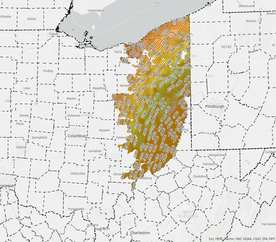 Description: This is a subsurface elevation grid constructed upon the top of the Oriskany Sandstone in Eastern Ohio. This dataset was originally created for the Midwestern Regional Carbon Sequestration Partnership 2017 final report (Department of Energy Cooperative Agreement No. DE-FC26-05NT42589). This data set contains subsurface information on the Devonian Oriskany Sandstone in eastern Ohio compiled from hardcopy and digital public data housed at the Ohio Department of Natural Resources (ODNR) Division of Geological Survey and Division of Oil and Gas Resources Management. Data points were determined by geologist using well logs throughout eastern Ohio in Petra software, and then exported in ArcGIS for contouring. Suspect tops were identified using cluster number. The resultant tops were gridded using both high-data density and low-data density models which were contoured, clipped, merged, and edited. The seamless contours were re-gridded with ArcGIS 3D Analyst.This work was funded in part of the Department of Energy Midwestern Regional Carbon Sequestration Partnership (Department of Energy Cooperative Agreement No. DE-FC26-05NT42589), and the Ohio severance taxes. The following staff members from the ODNR Division of Geological Survey worked on the dataset: Julie Bloxson and Michael Solis are the primary authors; technical support was provided by Dominique Haneberg-Diggs, Nathan Erber, and J.D. Stucker; additional contributions and oversight were provided by Mohammad Fakhari, Charles Salmons, Michael Angle, and Thomas Serenko.Author/Originator: Julie Bloxson and Michael Solis Date Created: 2017