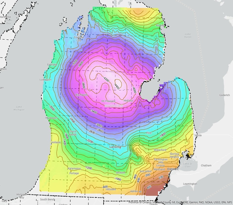 Description: This is a structure contour map representing the depth to top of the Devonian, Sylvania Sandstone in the Michigan basin. It was created by computer interpolation (kriging) of borehole data for the map extent and was intended for use in visual representation of depth to the Sylvania Sandstone and subsurface injection potential. These borehole data were quality controlled from Michigan DEQ, Geological survey tops data.Author/Originator: Michigan Geological SurveyDate Created: 2005