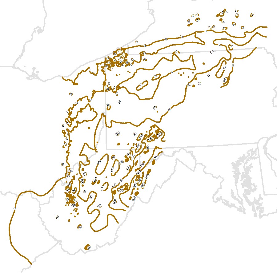 Description: This is an isopach contour map of the Oriskany Sandstone in New York, Pennsylvania, Maryland, West Virginia, Ohio and Kentucky.The contours were created from the related thickness grid or by hand contouring using the thickness point values.Author/Originator: Battelle Memorial InstituteDate Created: 2021