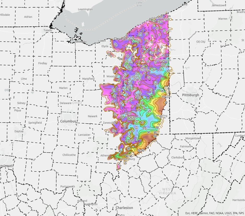 Description: This is a thickness grid of the Oriskany Sandstone in eastern Ohio. This dataset was originally created for the Midwestern Regional Carbon Sequestration Partnership 2017 final report (Department of Energy Cooperative Agreement No. DE-FC26-05NT42589). This data set contains subsurface information on the Devonian Oriskany Sandstone in eastern Ohio compiled from hardcopy and digital public data housed at the Ohio Department of Natural Resources (ODNR) Division of Geological Survey and Division of Oil and Gas Resources Management. Data points were determined by geologist using well logs throughout eastern Ohio in Petra software, and then exported in ArcGIS for contouring. Suspect tops were identified using cluster number. The resultant tops were used to generate initial contours using Inverse Distance Weighting in Geostatistical Analysist in ArcGIS. These initial contours were then hand edited to reflect formation thickness distribution patterns. The edited contours were then regridded to produce the final thickness grid.This work was funded in part of the Department of Energy Midwestern Regional Carbon Sequestration Partnership (Department of Energy Cooperative Agreement No. DE-FC26-05NT42589), and the Ohio severance taxes. The following staff members from the ODNR Division of Geological Survey worked on the dataset: Julie Bloxson and Michael Solis are the primary authors; technical support was provided by Dominique Haneberg-Diggs, Nathan Erber, and J.D. Stucker; additional contributions and oversight were provided by Mohammad Fakhari, Charles Salmons, Michael Angle, and Thomas Serenko.Author/Originator: Julie Bloxson and Michael SolisDate Created: 2017