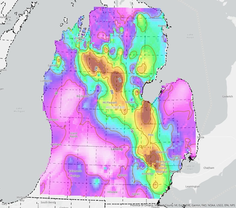 Description: This is an isopach contour map representing the thickness of the Devonian, Sylvania Sandstone in the Michigan basin. It was created by computer interpolation (kriging) of borehole data for the map extent. These borehole data were quality controlled with general guidelines in mind, for example, the Sylvania Sandstone is nowhere thicker than 350ft in the map area, but has highly variable thickness on small spatial scale. These thickness variations result from the stratigraphic position of the unit above the base Kaskaskia unconformity in Michigan.Author/Originator: Michigan Geological SurveyDate Created: 2005