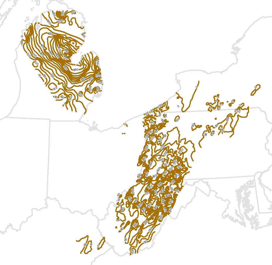 Description: This is an isopach contour map of the Devonian Mixed Carbonates and Clastics in Ohio, New York, Pennsylvania, Maryland, West Virginia and Kentucky and the laterally equivalent Bois Blanc and Sylvania Sandstone in Michigan.The contours were created from the related thickness grid or by hand contouring using the thickness point values.Author/Originator: Battelle Memorial InstituteDate Created: 2021