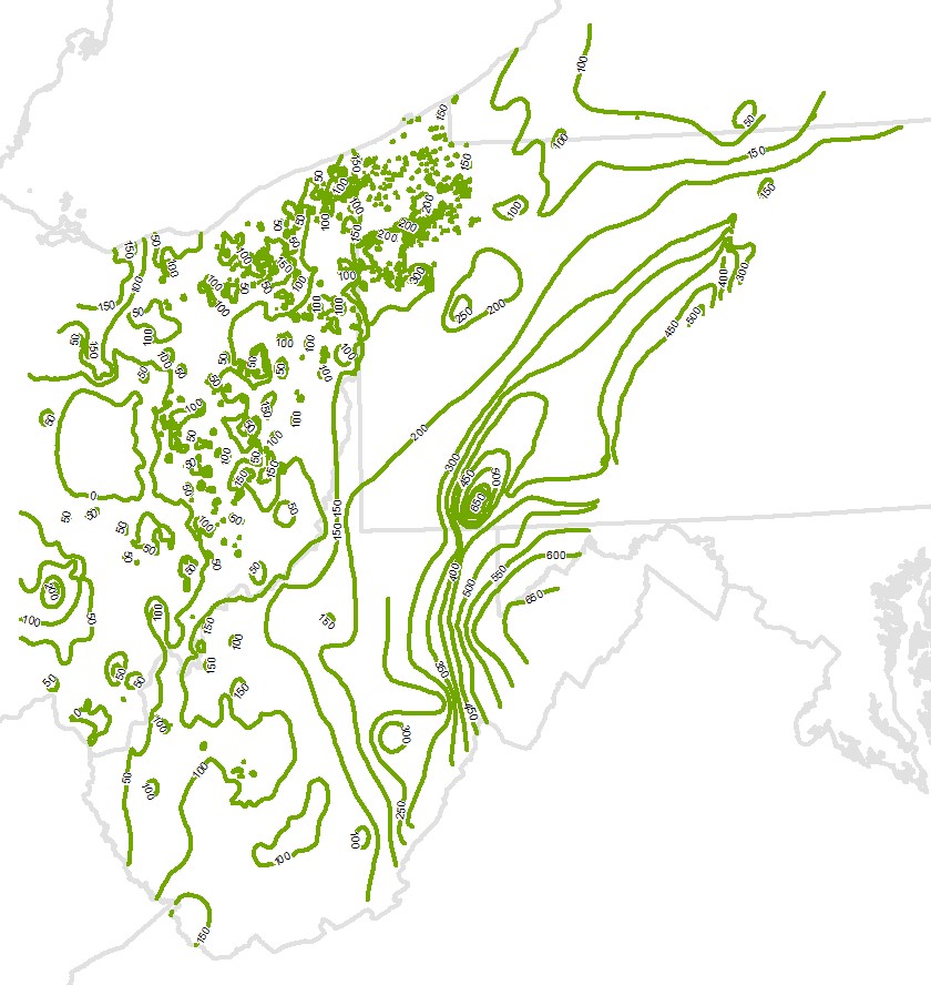 Description: This is an isopach contour map of the Medina Group/"Clinton" in Ohio and Pennsylvania, and the laterally equivalent facies of the Tuscarora Sandstone in Pennsylvania, West Virginia and Maryland.The contours were created by computer interpolation of borehole data obtained from Pennsylvania, Ohio and West Virginia from the related thickness grid using the thickness point values.Author/Originator: Battelle Memorial InstituteDate Created: 2021