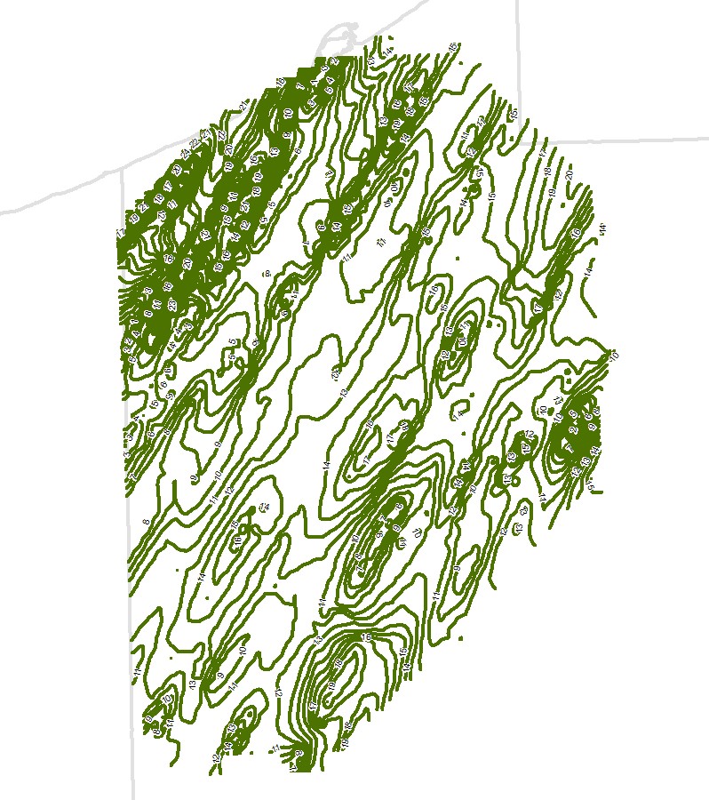 Description: This is an isopach contour map of the Whirlpool Sandstone of the Medina Group in Pennsylvania.The contours were created from the related thickness grid or by hand contouring using the thickness point values.Author/Originator: Battelle Memorial InstituteDate Created: 2021