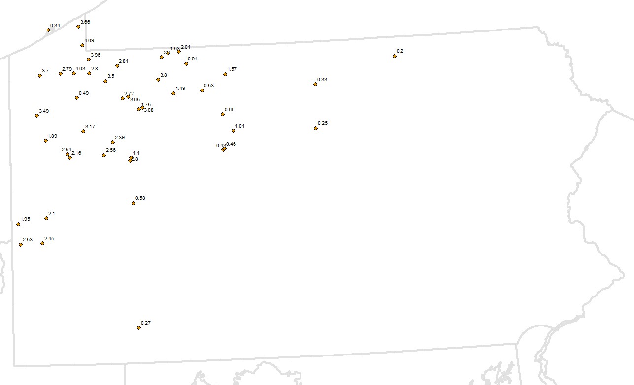 Description: This dataset contains the oil and gas well locations and Total Organic Carbon (TOC) values used to create the Total Organic Carbon (TOC) map for the West Falls Formation, mostly sampled from the organic-rich Rhinestreet member, in Pennsylvania.Author/Originator: Battelle Memorial InstituteDate Created: 2021