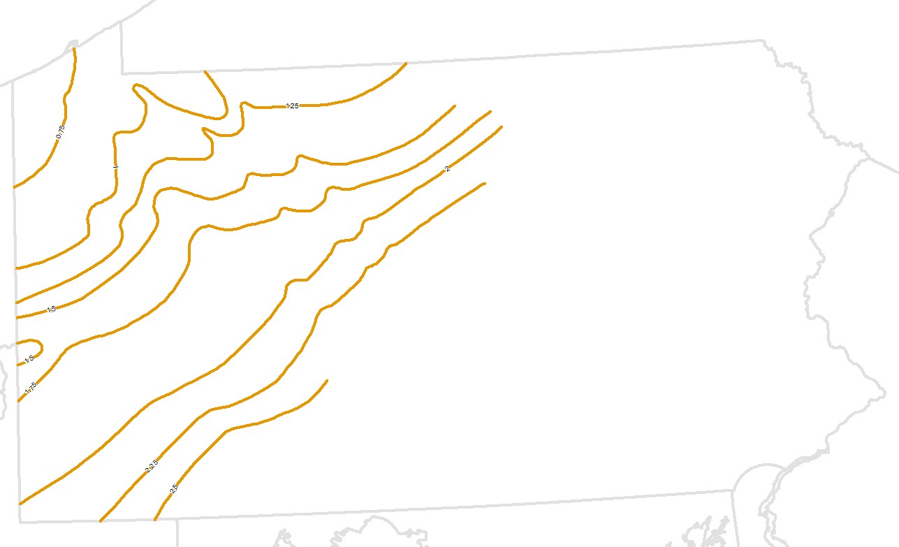 Description: This is a thermal maturity contour map, based on vitrinite reflectance (Ro) measurements of the West Falls Formation, mostly sampled from the organic-rich Rhinestreet member, in Pennsylvania.The contours were created by hand contouring using the thermal maturity (Ro) point values.Author/Originator: Battelle Memorial InstituteDate Created: 2021