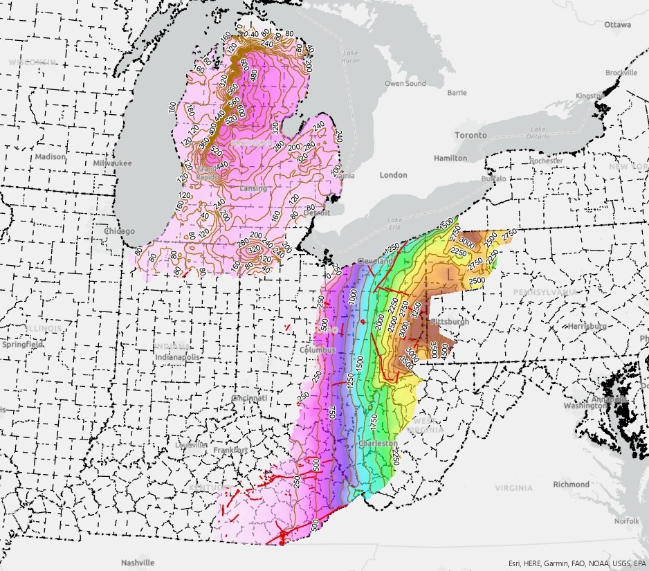 Description: This is a thickness grid of the Devonian Shales in the Appalachian and Michigan Basins, Indiana, Kentucky, Maryland, Michigan, Ohio, Pennsylvania, and West Virginia.Author/Originator: Kentucky Geological SurveyDate Created: 2005